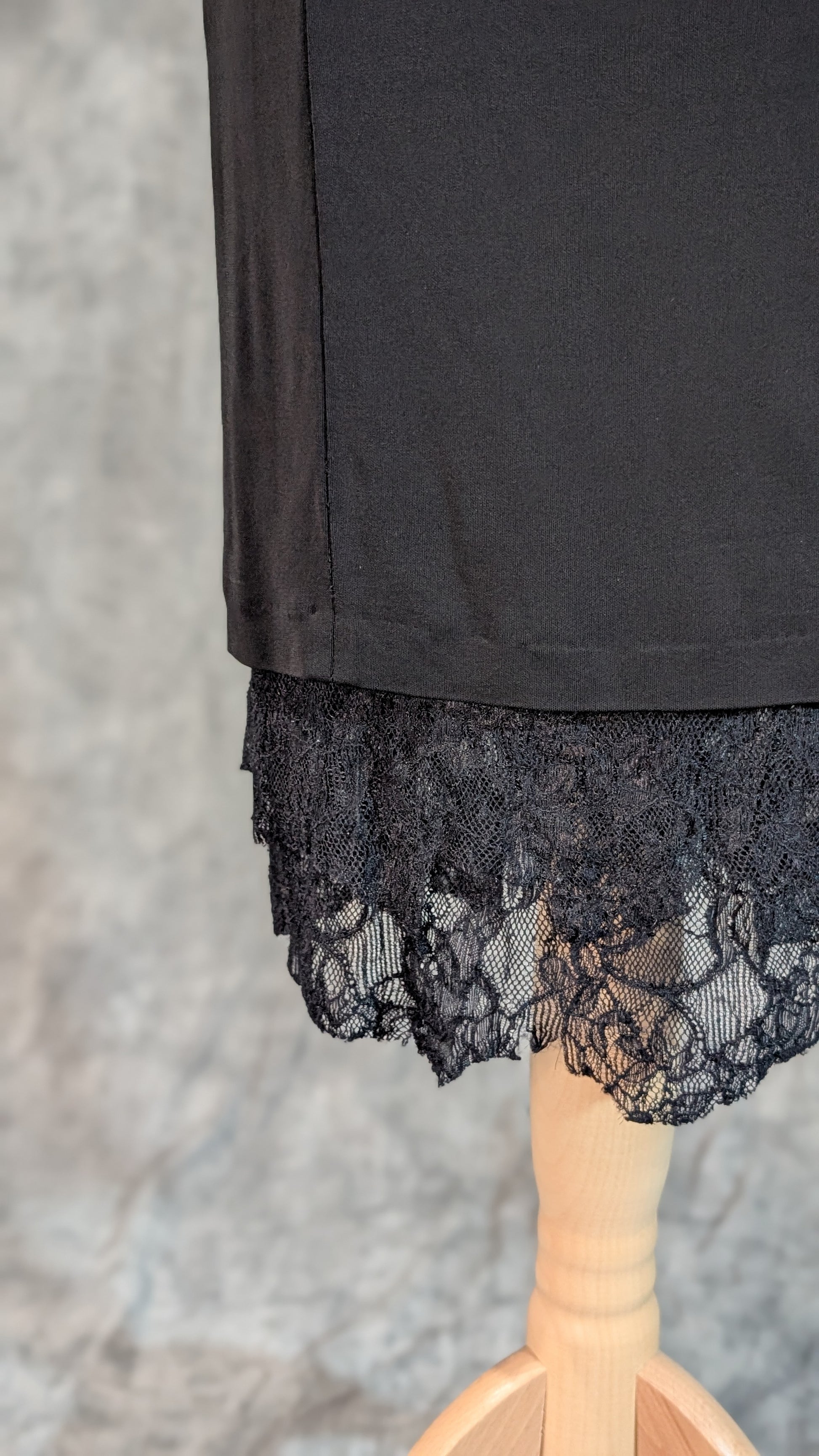 重厚なブラックの生地の下から、アンティークを思わせる繊細なブラックレースが覗く設計。これは単なる装飾ではなく、歩くたびに動き出す光と影のゲーム。夜の光を吸い込むようなブラックの中に、秘められた官能的な美しさが宿ります。