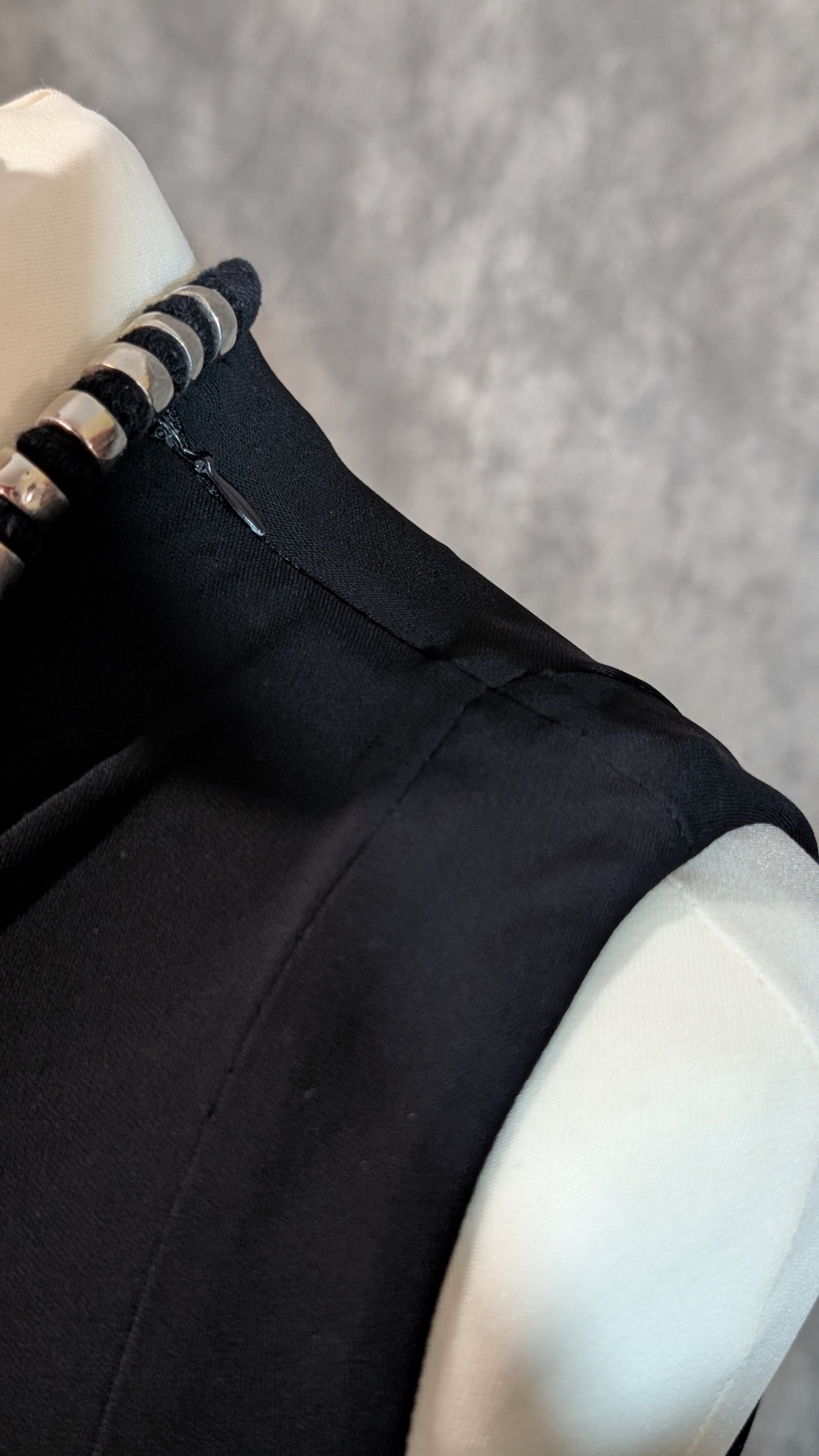 このクチュールライクな仕上げが、シンプルなノースリーブドレスを一瞬にして、オートクチュールのアプローチを持つ一着へと昇華させています。