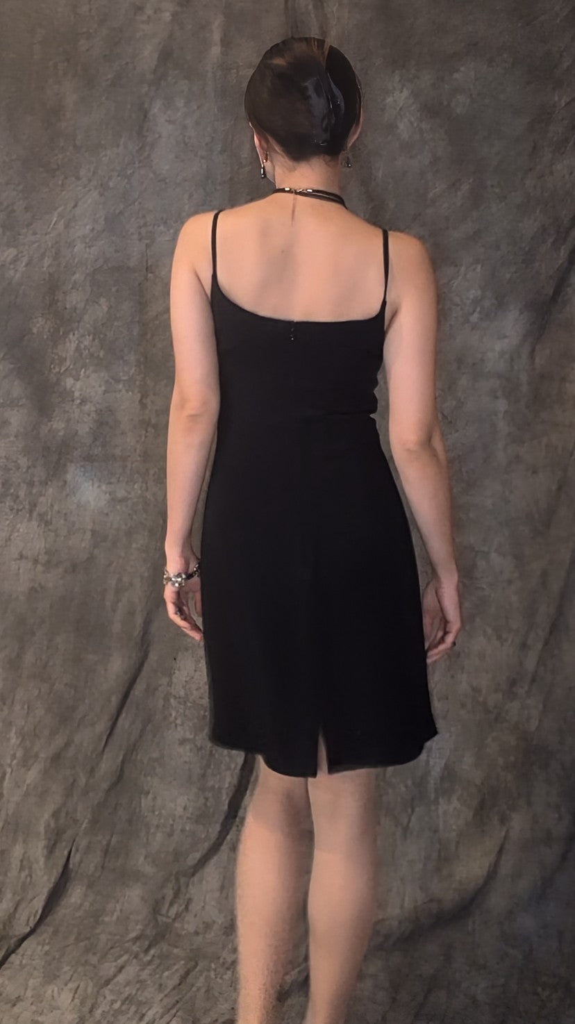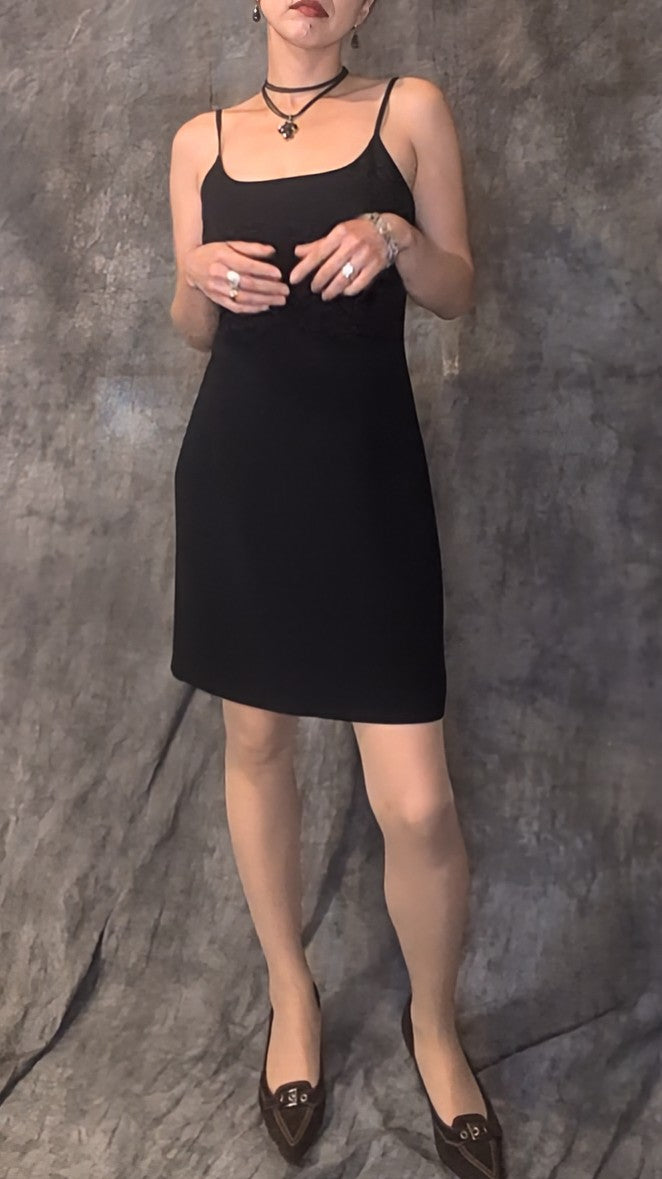深みのあるブラックが、貴女のボディラインを優雅に描き出します。細いスパゲッティストラップと計算し尽くされたシンプルなシルエットは、過剰な装飾を排した究極のラグジュアリー。表地の滑らかなアセテートとビスコースのブレンド、そして裏地の柔らかなキュプラが織りなす極上の着心地は、まさに貴女だけの特権です。