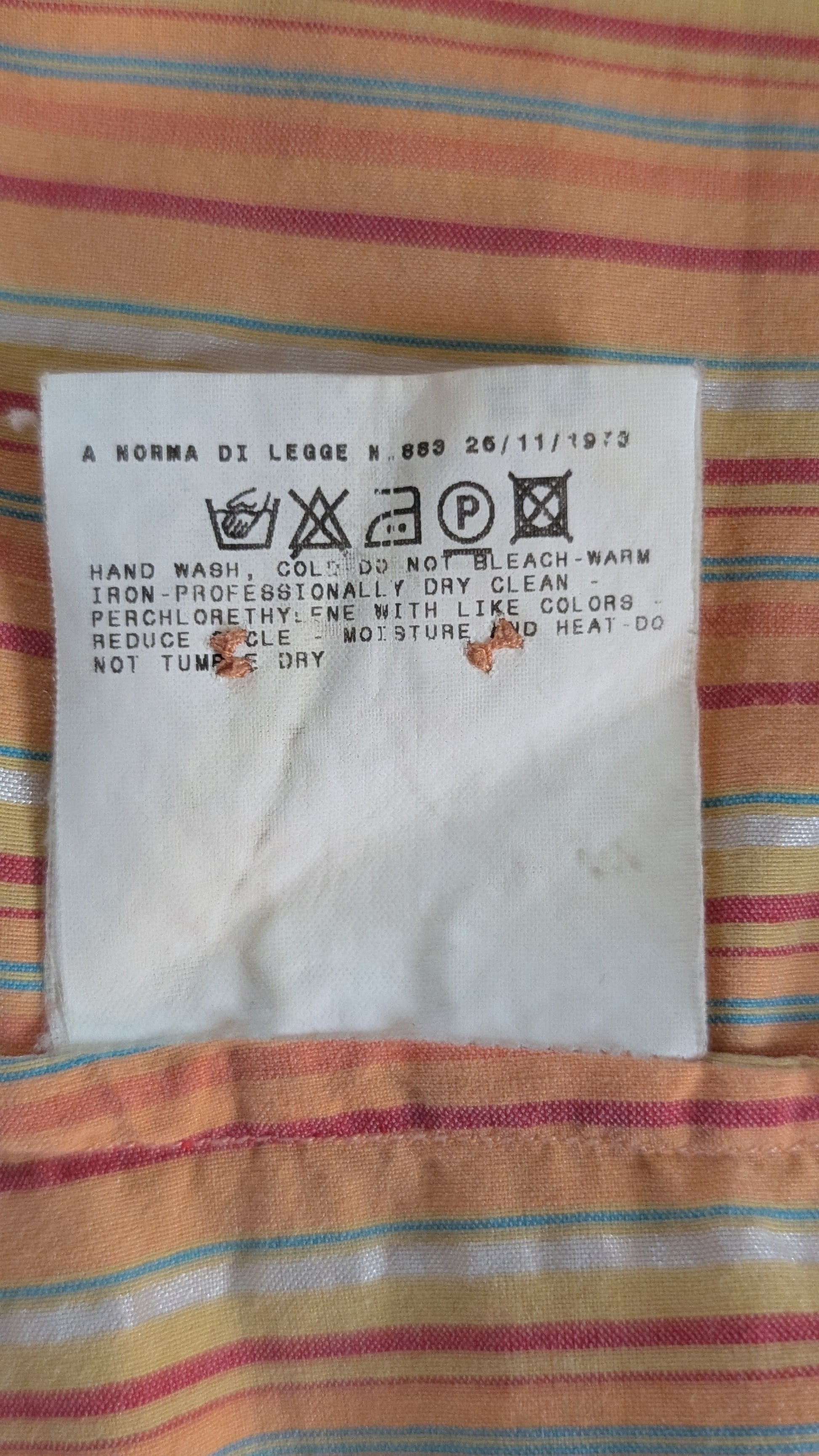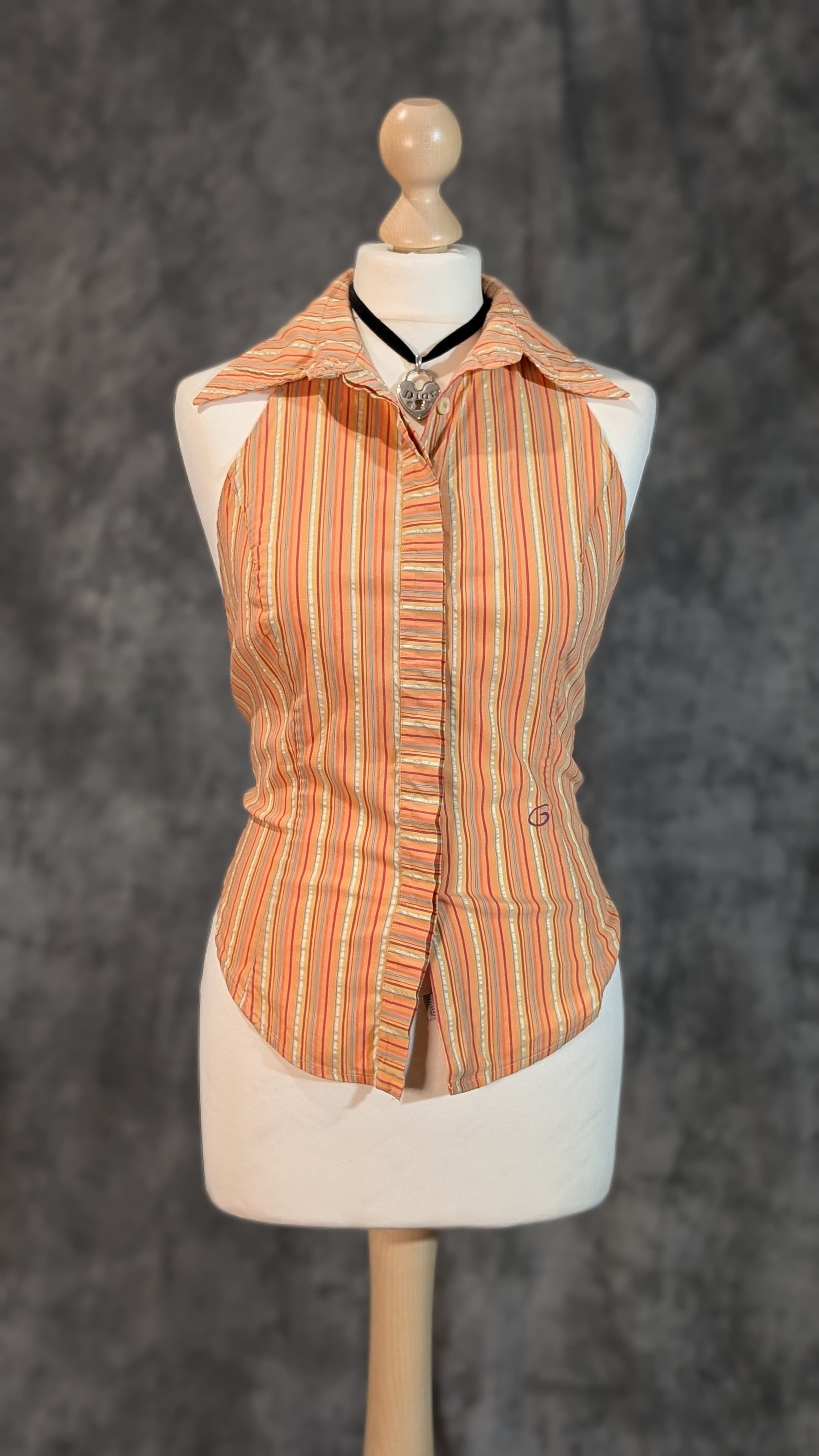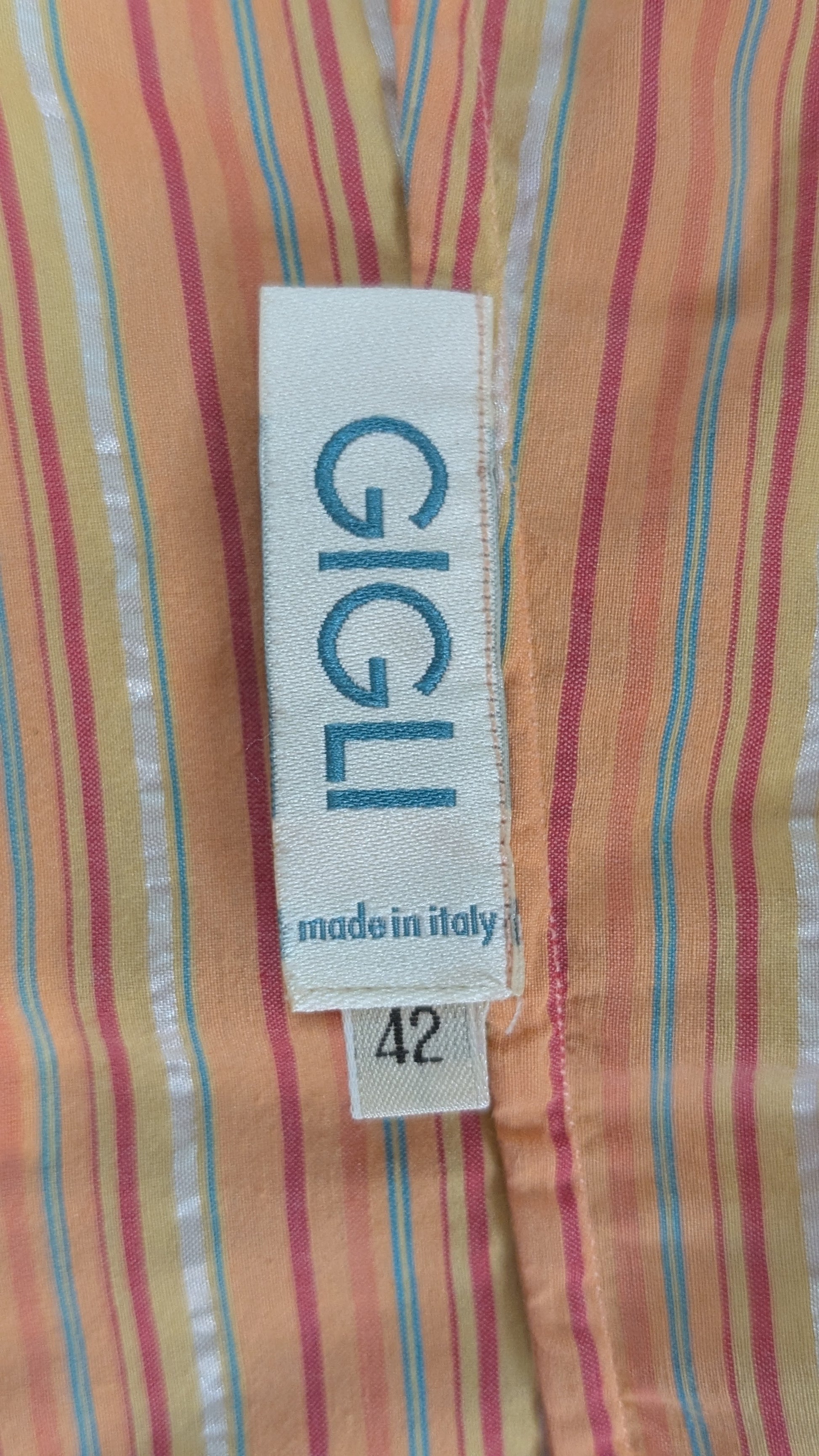 【豆知識】1980〜90年代に人気を博したイタリアブランド「GIGLI」。本品はFENDI傘下で生産されていた貴重なアイテムで、鮮やかなストライプとホルターネックデザインが特徴。90年代らしい遊び心あるデザインながらも、シルエットはモダンでスタイリングに取り入れやすい一着。