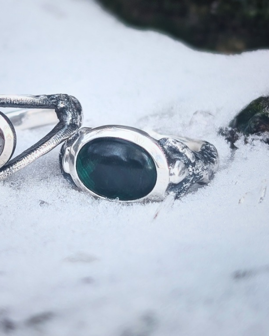 有機的なラインを描くシルバーは、作家の手仕事による唯一無二の表情。熱のエネルギーを宿したその質感は、無機質な金属でありながら、どこか温もりと生命の鼓動を感じさせます。