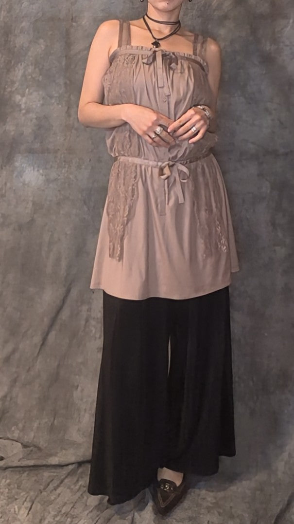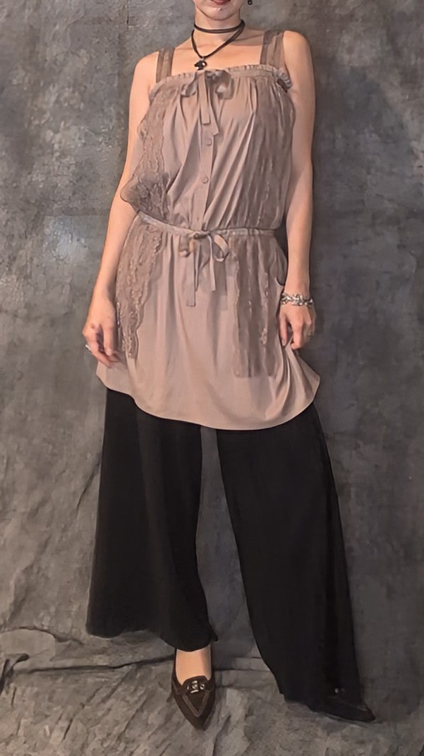 深く洗練されたトープカラーのシルクをベースに、サイドに贅沢にあしらわれた繊細なレースが、肌に触れるたび、視線を惹きつけるたびに、静かなる官能を演出。ストラップやウエストにあしらわれたリボンは、甘さを抑えつつ、モダンなドレープを生み出し、洗練されたシルエットを描き出します。