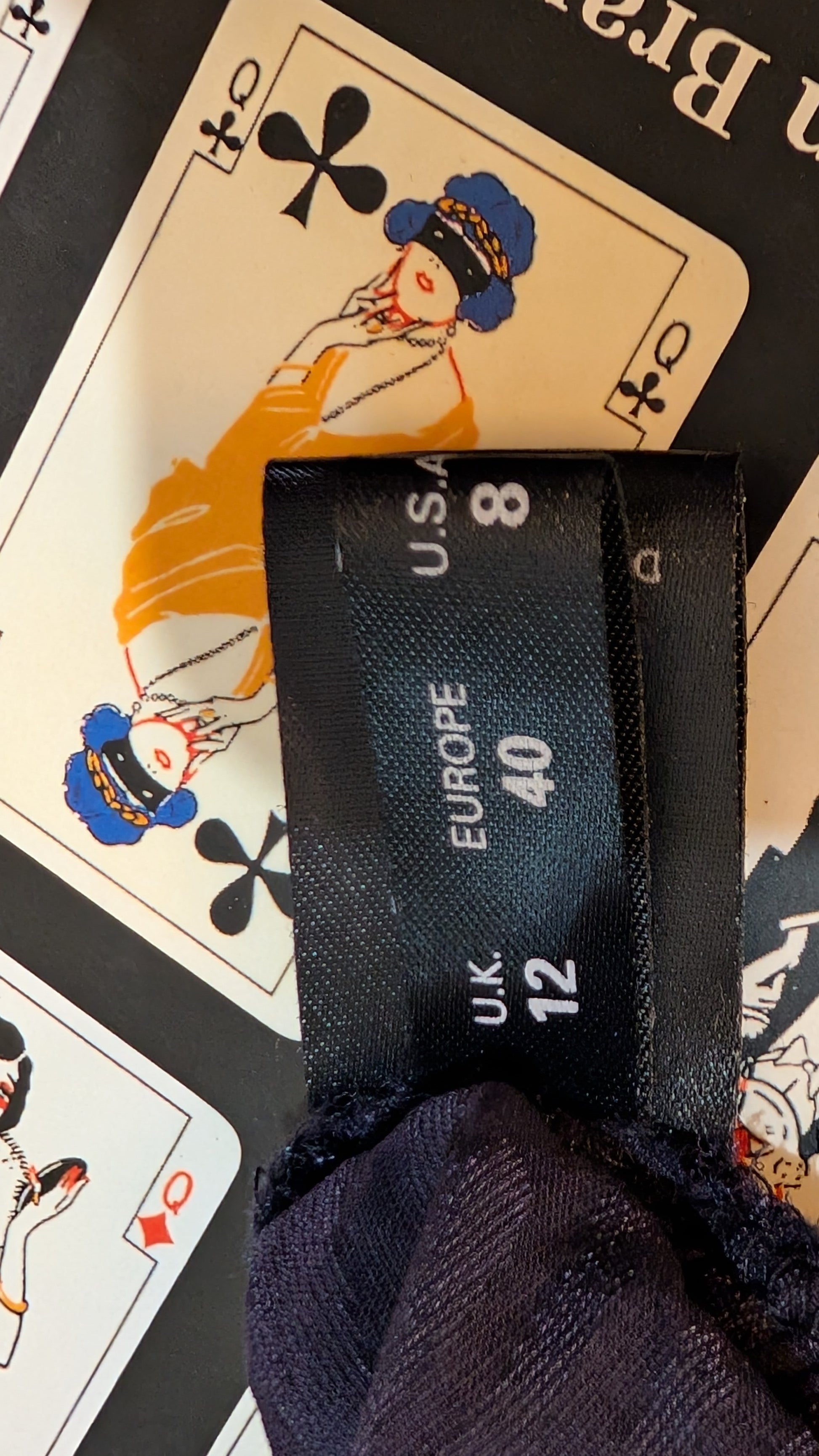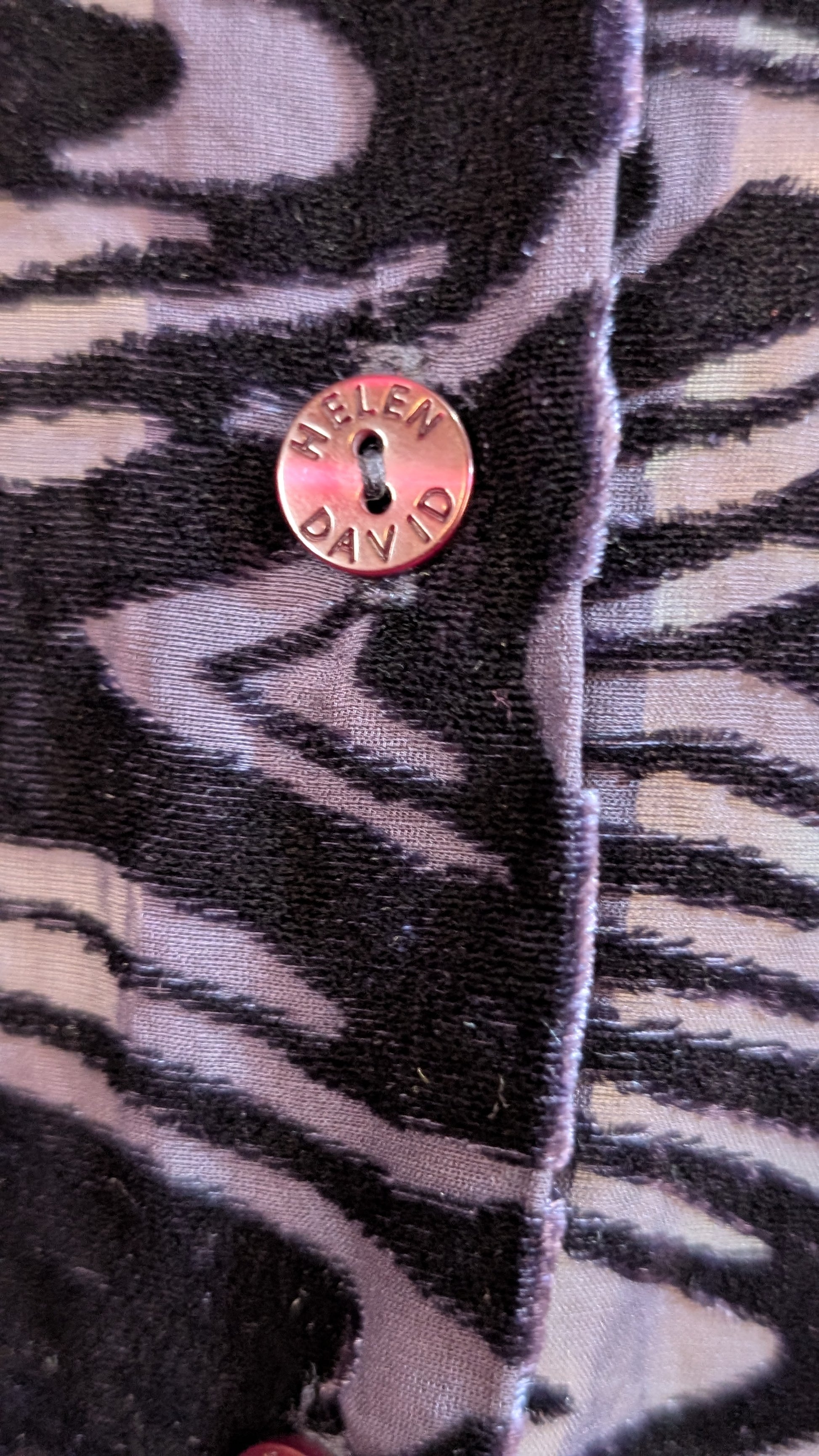 夜の帳(とばり)を思わせるダークトーン パープルのベルベットが、肌の上で官能的にたゆたう。1990年代の英国ファッション界を象徴するデザイナー、**Helen David(English Eccentrics)**が手がけた、まさに芸術品です。
