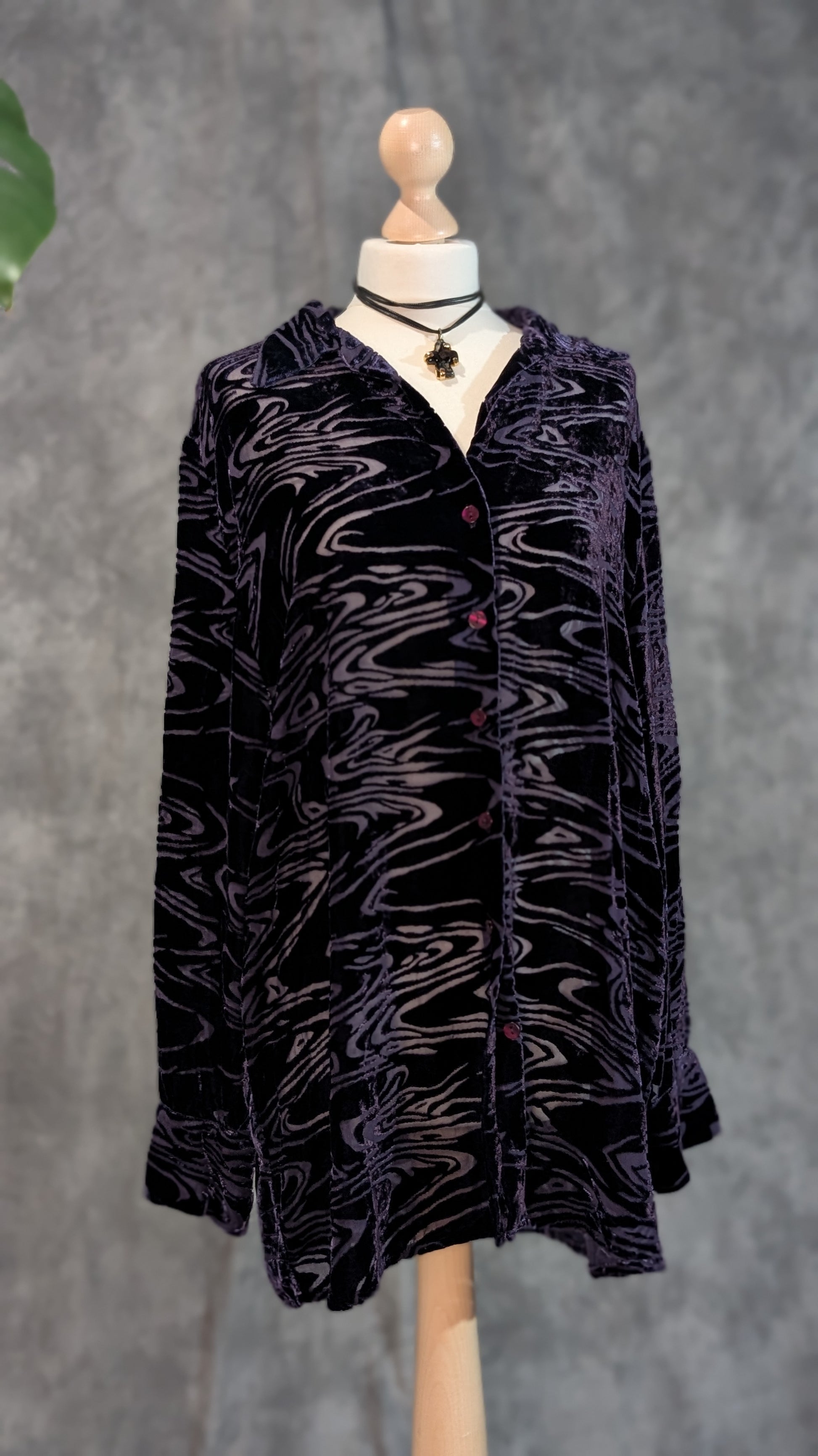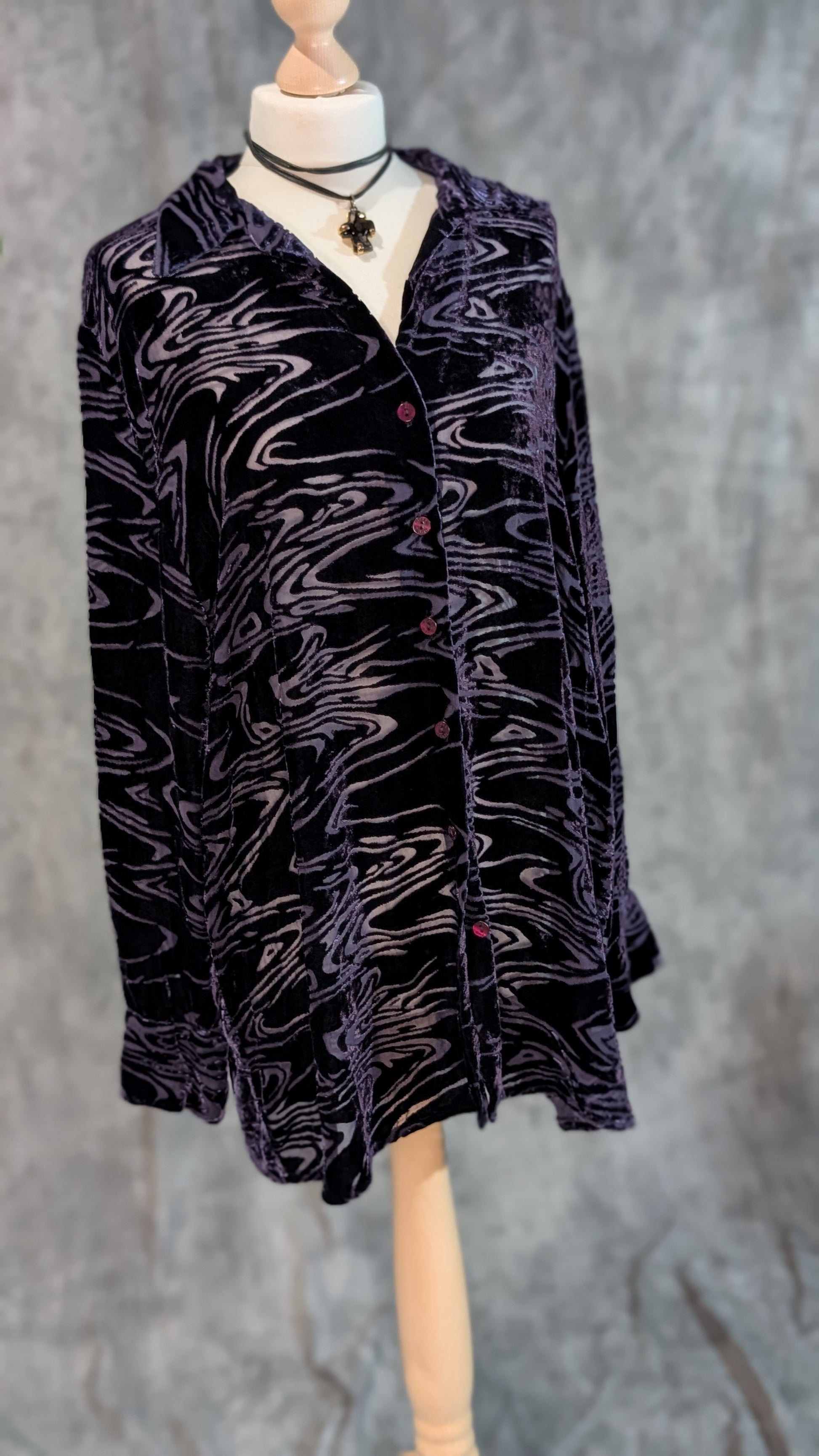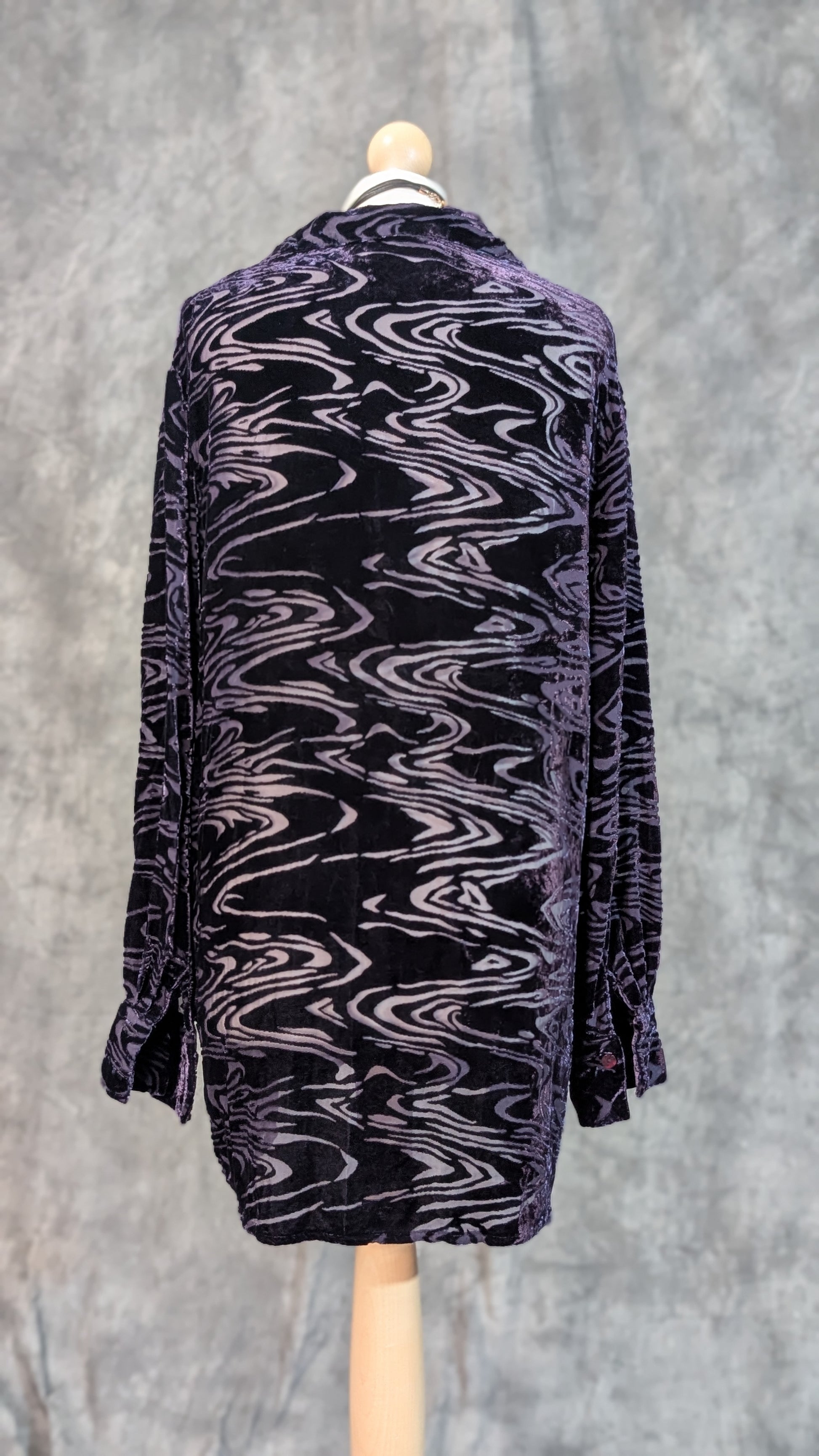 素材は、デヴォレ(デボア)技法によってエレガントな柄が浮かび上がった**レーヨン82%、シルク18%**の極上のベルベット。深く濃密な紫のベースに、光の加減でシルバーのように煌めく波紋のような模様が揺らめきます。その複雑で奥行きのあるテクスチャーは、まるで秘密の夜会で交わされる囁きのように、周囲の視線を引きつけ、決して離しません。